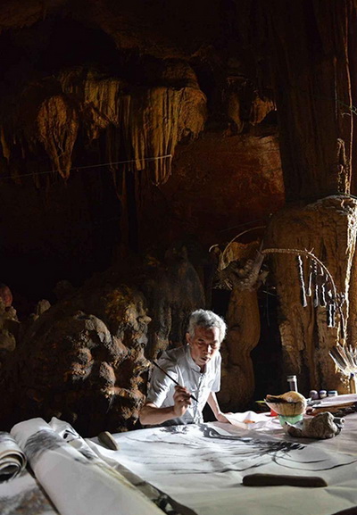 7月19日,宋傳中在山洞中作畫。宋傳中巢居的山洞位于余慶縣構(gòu)皮灘集鎮(zhèn)約一公里處,山洞約60平方米,洞內(nèi)石柱、石筍、鐘乳石千姿百態(tài)。一張床,一畫案,一茶桌是洞中全部“家具”,他取名為“清玄洞”,意為清靜、神秘、逍遙自在不受約束。