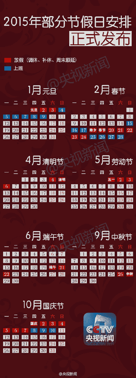 經(jīng)國務(wù)院批準(zhǔn),現(xiàn)將2015年元旦、春節(jié)、清明節(jié)、勞動節(jié)、端午節(jié)、中秋節(jié)和國慶節(jié)放假調(diào)休日期的具體安排通知如下。