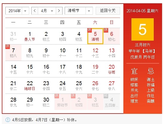 根據(jù)國(guó)務(wù)院辦公廳通知精神,2014年清明節(jié)放假安排如下:4月5日(星期六,清明節(jié))放假,4月7日(星期一)補(bǔ)休,一共三天時(shí)間。